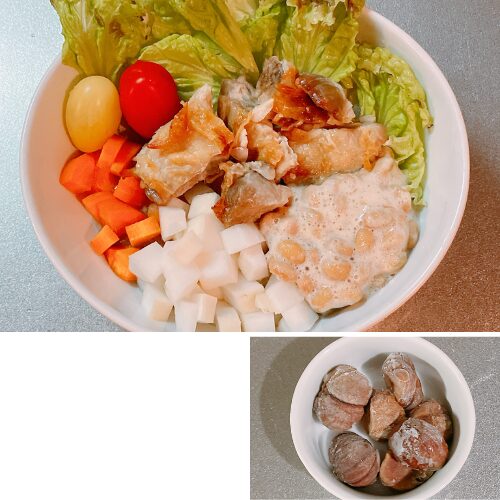 その代わり、他の食事ではレンズ豆ごはん160gで作った雑炊を朝・昼・夜に分けて食べ、糖質をセーブ。