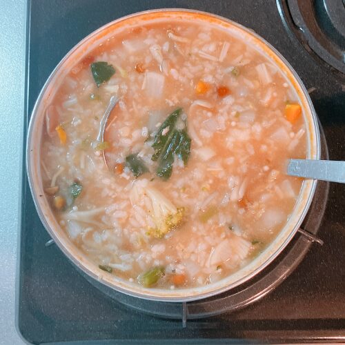 野菜たっぷりトマトスープをベースに、レンズ豆ごはんを入れて一緒に煮込んだ雑炊。